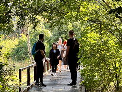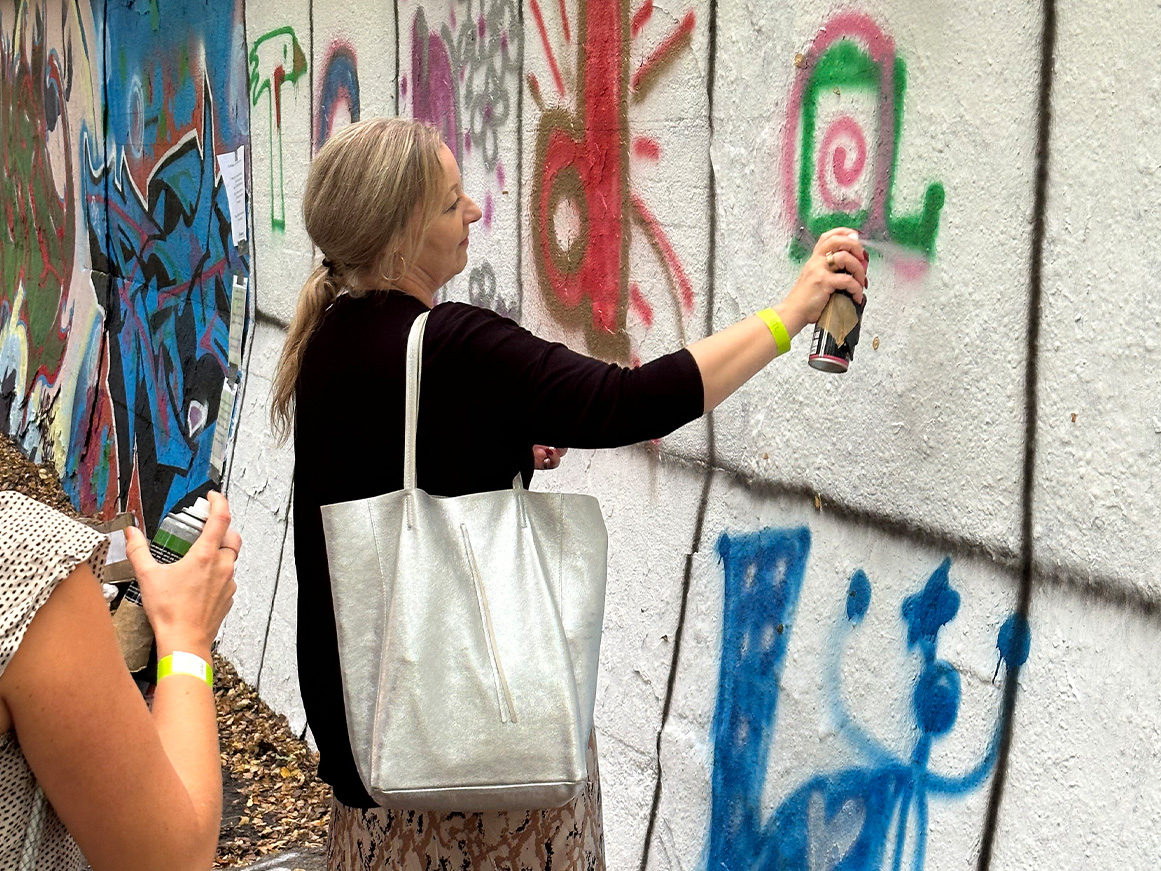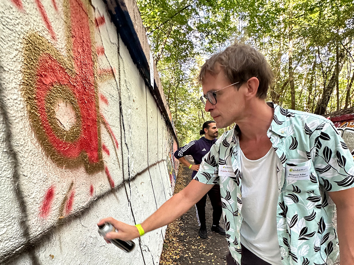 Rund 120 tandem-Mitarbeiter*innen fanden sich nachmittags ein, um bei schönstem frühherbstlichen Wetter nebenbei einen ganz besonderen Ort zu erkunden: Denn der Park befindet sich auf dem Gebiet des ehemaligen Rangierbahnhofs Tempelhof. Heute kann hier eine einzigartige Verbindung von alter Bahntechnik, wild gewachsener Natur sowie Kunst erlebt werden. Wer hier spazieren geht, findet zwischen Sträuchern und Bäumen alte Gleise, Wasserkräne, Lichtmasten, eine Dampflokomotive und eine der ältesten Drehscheiben Deutschlands.